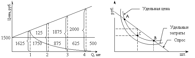 Цена, установленная, ориентируясь на затраты, означает, что в точке А и точке В ожидания продавца (производителя продукции) оправдывается. Спрос будет удовлетворяться по цене А. Если производитель выберет комбинацию точки С, то спрос окажется выше или может быть удовлетворен по более высокой цене. В любой случае, прибыль увеличивалась против величины, предусмотренной ранее. Следовательно, что желаемый объем сбыта и расчетная цена, как правило, не соответствует на рынке друг другу, кроме т. А и т. В.