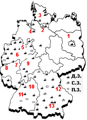 д.з. - действующие заводы; с.з. - строящиеся заводы; п.з. - планируемые заводы. 1- Берлин; 2 - Гамбург; 3 - Киль; 4 - Бремен; 5 - Эссен; 6 - Дюссельдорф; 7 - Бонн; 8 - Аахен; 9 - Франкфурт; 10 - Гейдельберг; 11 - Штутгарт; 12 - Нюрнберг; 13 - Мюнхен. Все действующие мусоросжигательные заводы Германии расположены на территории бывшей ФРГ. В ГДР, как и в других странах социалистического лагеря, мусор в основном вывозили на свалки. |