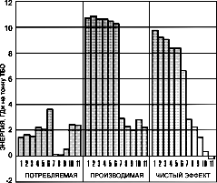 На диаграмме показана энергетическая эффективность одиннадцати применяемых в США технологий переработки бытовых отходов. Наибольшим энергетическим эффектом обладают комбинированные методы с применением установок по утилизации материалов и сжиганию или непосредственное сжигание неподготовленных отходов с выработкой тепловой и электрической энергии, а наименьшим - компостирование с захоронением неорганических остатков: 1 - утилизация плюс сжигание; 2 - сжигание неподготовленных отходов; 3 - утилизация материалов с раздельным сбором плюс сжигание; 4 -непосредственное сжигание топлива, полученного из отходов; 5 - утилизация материалов с раздельным сбором плюс сжигание топлива, полученного из отходов; 6 - утилизация отходов с раздельным сбором плюс сжигание плюс компостирование; 7 - утилизация материалов с раздельным сбором плюс захоронение; 8 - захоронение со сбором газа; 9 - подготовка топлива, полученного из отходов, плюс компостирование; 10 - утилизация материалов с раздельным сбором плюс захоронение плюс компостирование; 11 - компостирование отходов плюс захоронение. |