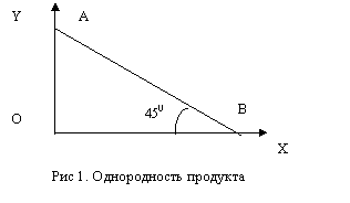 В терминах теории полезности однородность продукта означает, что продукты разных производителей полностью взаимозаменяемы для каждого покупателя, причем предельная норма замещения одного продукта другим равна единице. Например, замена в наборе апельсина одного производителя на апельсин другого производителя не изменяет полезности набора. В этом случае каждая кривая безразличия покупателя представляет собой отрезок прямой, наклоненный к осям координат под углом 450. На рис.1 кривая безразличия для продуктов двух разных производителей обозначена через АВ. Через X обозначено количество в наборе продукта первого производителя, а через Y – второго производителя.