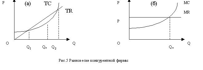 Если выпуск фирмы лежит в пределах от Q1 до Q2, то кривая выручки расположена выше кривой издержек, и прибыль фирмы положительна. Для каждого выпуска из этого промежутка прибыль равна длине вертикального отрезка, соединяющие соответствующие точки кривой выручки и кривой издержек. На рис.5 (а) эти отрезки образуют фигуру, которая напоминает рыбу, а максимальная прибыль равна самому толстому сечению этой «рыбы». Максимум прибыли достигается, когда касательная к графику общих издержек параллельна графику функции выручки, то есть предельные издержки равны цене продукта. На рис.5 равновесный выпуск обозначен через Q*.