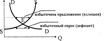 2) избыточное предложение, когда количество благ, предлагаемых на рынке, превышает количество спрашиваемых. Признаки такого положения—рост товарных запасов (они превышают уровень, запланированный на случай нормальных изменений спроса) и появление очередей предпринимателей, продавцов, предлагающих услуги.