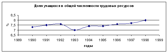 За указанный период доля учащихся в общей доле трудовых ресурсов возросла с 7,3% до 8%. Такая тенденция сложилась, на взгляд автора, в большей степени в результате возрастания трудностей, связанных с вопросом трудоустройства данной социально-демографической группы и в меньшей степени, вероятно, с ростом престижа образования в глазах молодежи. Причем, до 1993 г. наблюдалось снижение, а начиная с 1993 г. устойчивый рост данного показателя (диаграмма 1).