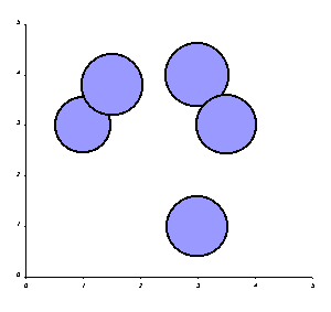 Рис. 3. Взаимное расположение пяти выделенных кластеров индивидов с разными социально-экономическями установками в системе координат "либерализация" (ось абсцисс: суммированы параметры "полная свобода частного предпринимательства" и "привлечение иностранного капитала") и "государственный контроль" (ось ординат: суммированы параметры "государственный контроль цен", "замораживание цен и зарплаты" "усиление государственного контроля над частным бизнесом", "ограничение ввоза иностранных товаров"). Площадь кружков соответствует относительной величине групп, координаты их центров - усредненные значения центров, соответствующие исходной ранговой шкале (ранги в интервале от 0 до 5). Номера кружков - номера описанных в тексте кластеров.