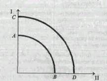 Увеличение объема ресурсов и повышение их качества за счет НТП приведет к смещению кривой производственных возможностей из положения АВ в положение CD. Если кривая производственных возможностей АВ (или CD) рассчитана с учетом нормативного использования производственных мощностей, то ее можно назвать номинальной кривой. Реальная кривая будет находиться внутри кривой АВ (или CD), так как на практике не бывает полного использования ресурсов экономического роста, что нетрудно видеть из анализа табл. 1