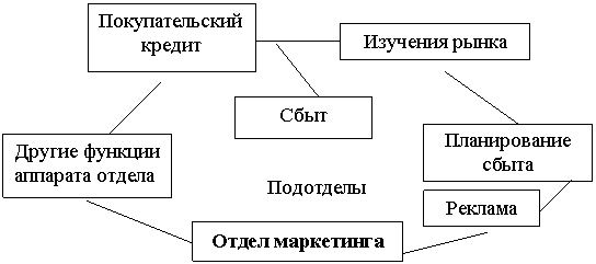 В соответствии с 1-м вариантом создается структура отдела всеохватывающего типа с более четкими разграничениями и определениями функций подотделов. В подотделах будет произведено разделение труда в различных видах деятельности по маркетингу и за каждым из них закреплены обязанности. На схеме № 4 показана структура такого отдела. Типичными подотделами являются: сбыт, планирование сбыта; изучение рынка, "РК"; покупательный кредит. Среди этих подотделов подразделение по сбыту- единственное, напрямую связанное с организационной иерархией. Остальные осуществляют функции собственно аппарата отдела.
