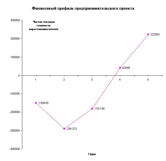 5. Максимальная величина рискуемого капитала – это наибольшее отрицательное значение чистой дисконтированной (текущей) стоимости, рассчитанной нарастающим итогом. Этот показатель отражает необходимые размеры финансирования и должен быть увязан с источниками покрытия всех затрат. Он отражается в таблице денежных потоков и может быть выделен на графике финансового профиля проекта.(График 7.2.2.)