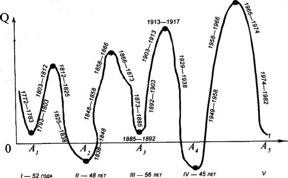 Чаще всего выделяют следующие пять длинных волн (рис. 7). Вместе с тем некоторые современные исследователи выражают мнение, что волны Кондратьева зародились в Китае на рубеже первого и второго тысячелетий нашей эры, переместившись затем по Великому шелковому пути в Италию, и, набрав темпы XV в., достигли стадии зрелости с укреплением океанской торговли, в которой господствовали Нидерланды и Бразилия. Американские исследователи Дж. Модельски и У. Томпсон выделяют следующие длинные волны в мировой цивилизации:
