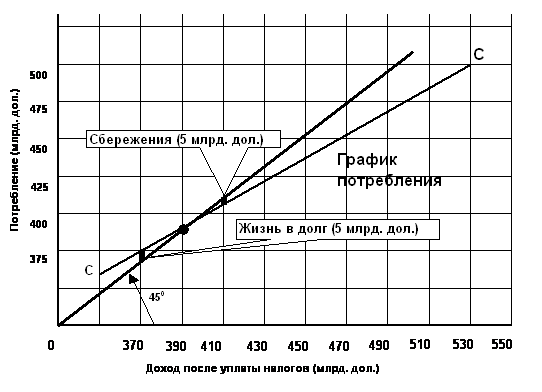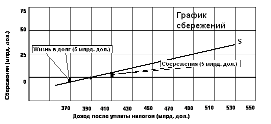 Каждая точка биссектрисы - есть точка, в которой DI равен потреблению, следовательно, "жизнь в долг" наступает при относительно низкой величине DI, скажем 370 млрд. дол. Значит, домохозяйства будут потреблять сверх своих текущих доходов путём снижения сбережений или занимая средства в долг. На графике 4.1 величина, на которую потребление выше биссектрисы, равна величине, на которую сбережения ниже оси абсцисс на графике 4.2 при уровне объёма производства и дохода в 370 млрд. дол. В данном случае каждый из этих двух отрезков по вертикали равен "влезанию в долги" на сумму 5 млрд. дол. Это происходит при доходах в 370 млрд. дол. Уровень дохода в 390 млрд. дол. (строка 2) является пороговым доходом. При этом уровне домохозяйства потребляют свои доходы полностью. Графически на этом уровне прямая потребления пересекает биссектрису, а прямая сбережений – ось абсцисс (сбережения равны нулю). При всех других, более высоких доходах домохозяйства будут планировать сбережения части своего дохода. Величина, на которую прямая потребления ниже биссектрисы, показывает уровень сбережений точно также, как и величина, на которую прямая сбережений выше оси абсцисс.