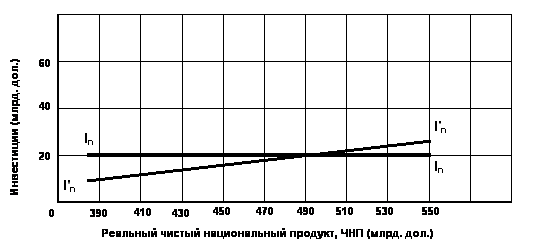 Подобное допущение независимости инвестиций и дохода конечно же упрощение. Повышение уровня деловой активности может вызвать дополнительные расходы на основной капитал, что показано в колонках 1 и 3 таблицы 3 и графика In (рис. 7). Существует, по крайней мере две причины, почему инвестиции могут изменяться непосредственно с изменением дохода. Во-первых, инвестиции связаны с прибылью; крупные инвестиции финансируются из предпринимательской прибыли. Поэтому весьма правомерно утверждать, что с возрастанием дохода после уплаты налогов и ЧНП будет возрастать прибыль и соответственно уровень инвестирования. Во-вторых, при низком уровне дохода и объёма производства в предпринимательском секторе будут иметься неиспользованные или излишние производственные мощности, то есть на многих предприятиях будет простаивать оборудование. А это значит, что стимул для закупки дополнительного основного капитала будет незначительным. Но как только уровень дохода вырастет, этот излишек мощностей исчезнет, и у фирмы появится стимул пополнять свой основной капитал. Наше упрощение, однако, не сильно расходится с действительностью и в значительной степени облегчит дальнейший анализ. Но в действительности график инвестиций может слегка подниматься, как показано с помощью кривой I'n.