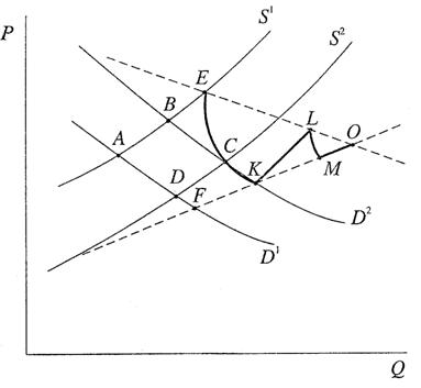 Движение по кривой ECK отражает три точки частичного равновесия: при переходе из E к C производитель S1 и потребитель D1 уходят с рынка, оставшийся производитель S2 более рентабельный, чем S1 , взаимодействует с потребителем D2 , более платежеспособным, чем D1 . Дальнейший переход от C к K соответствует вступлению в рынок опять производителя S1 при сохранении прежнего потребителя. Переход от K к L соответствует возвращению на рынок второго, менее платежеспособного, потребителя D1 , сопровождаемое захватом излишка потребителей со стороны производителей (точка М) и т.д.