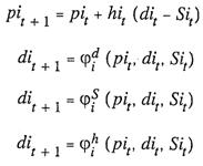 где pit – цена i-й услуги в текущий момент t , dit – соответствующий спрос, а Sit - соответствующее предложение ; hit – положительный коэффициент регулирования скорости изменения цен во времени.