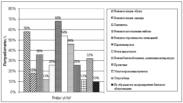 Частота пользования различными видами услуг отражена в таблице 5. Из нее можно заключить, что наиболее часто респонденты пользуются услугами ателье по ремонту обуви, фотовидеоуслугами, парикмахерскими, услугами бань, прачечных и химчисток.