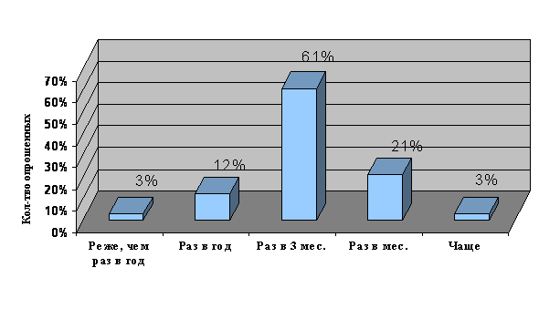 Имеются также дополнительные платные услуги (простыни, полотенца и др.) стоимостью от 1 руб. до 10 руб. Из числа опрошенных баню посещают 58%. Частотное распределение посещения бань представлено на рис. 11.