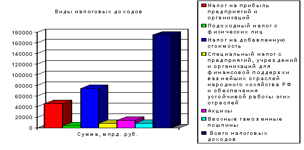 Как видно из таблицы и из диаграммы, ведущее место среди налоговых доходов бюджета (свыше 1/3) занимает налог на добавленную стоимость. Вместе с таможенными пошлинами и налогом на прибыль он превышает 2/3 налоговых доходов федерального бюджета.