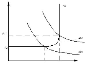 Увеличение денежной массы в течение короткого промежутка времени сдвигает кривую совокупного спроса вправо (AD1-AD2) и если экономика находится на промежуточном(2) или классическом (3) отрезках кривой совокупного предложения, то это ведет к росту цен, что представляет инфляцию спроса.