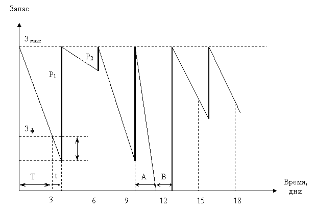 Графически модель системы контроля за состоянием запаса с фиксированной периодичность заказа представлена на рисунке 4.