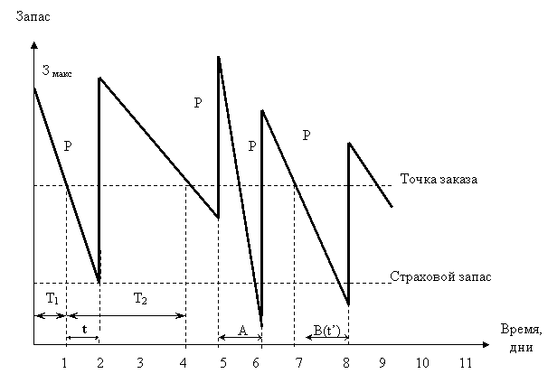 Нормируемыми величинами в этой системе являются величина заказа, размер запаса в момент размещения заказа (так называемая точка заказа) и величина страхового запаса. Заказ на поставку размещается при уменьшении наличного запаса до точки заказа. Как следует из чертежа, после размещения заказа запас продолжает уменьшаться, так как заказанный товар привозят не сразу, а через какой-то промежуток времени t. Величина запаса в точке заказа выбирается такой, чтобы в нормальной, рабочей ситуации за время t запас не опустился ниже страхового. Если же спрос непредвиденно увеличится (линия графика резко пойдет вниз - участок А графика), или же будет нарушен срок поставки (t¢ > t - участок В графика), то начнет работать страховой запас. Коммерческая служба предприятия в этом случае должна принять меры, обеспечивающие дополнительную поставку. Как видим, данная система контроля предусматривает защиту предприятия от образования дефицита.