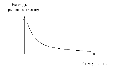 И расходы по доставке и расходы по хранению зависят от размера заказа, однако характер зависимости каждой из этих статей расходов от объема заказа разный. Расходы по доставке товаров при увеличении размера заказа очевидно уменьшаются, так как перевозки осуществляются более крупными партиями и , следовательно реже. График этой зависимости, имеющей форму гиперболы, представлен на рис. 6.