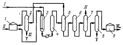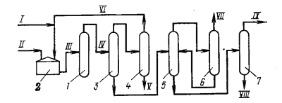 1-реактор этерификации; 2-подогреватель; З-отпарная колонна; 4-колонна ректификации метанола; 5,6,7-ректификационные колонны; I-метанол; II-ТФК; III-пульпа; IV-ДМТ-сырец; V-вода; VI-рецикл метанола; VII-легкокипящие примеси; VIII-тяжелый остаток в рецикл; IX-чистый ДМТ.