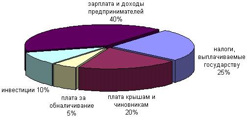 Что касается другой операции - обналичивания под фиктивные контракты, то ее масштабы оценить труднее. Теневая экономическая деятельность требует прежде всего наличных денег. По оценкам, даже без учета потребительского рынка и банковского бизнеса величина теневого налично-денежного оборота составляет более 30 млрд. долл. Существует довольно много фирм, специализирующихся на оказании данной услуги предприятиям. В 1992-1994 гг. их деятельность во многих регионах была совершенно открытой и они брали относительно небольшую плату за свои услуги. С 1995 г. власти стали преследовать такие фирмы и большинство их ушло "в подполье". В настоящее время обналичивание - сложившийся институт, обеспечивающий легальный бизнес неподконтрольными государству деньгами в объеме, определяемом потребностями выплат: во-первых, теневой части зарплаты, то есть разницы между реальной ценой труда, требуемой для удержания и стимулирования работников, и официальной зарплатой, показываемой в отчетности перед государственными органами; во-вторых, по теневым соглашениям за товары поставщикам; в-третьих, различным "крышам" и чиновникам для обеспечения своей безопасности и сохранения занимаемой на рынке ниши. В результате доходы, получаемые в легальном бизнесе, имеют весьма большую теневую составляющую, равную, примерно 1/4 (см. рис.).