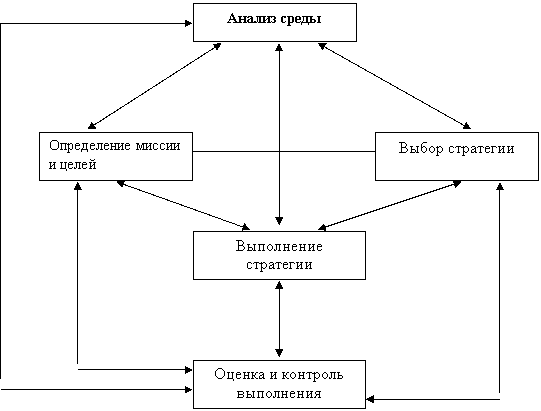 Стратегическое управление можно рассматривать как динамическую совокупность пяти взаимосвязанных управленческих процессов. Эти процессы логически вытекают (или следуют) один из другого. Однако существует устойчивая обратная связь и соответственно обратное влияние каждого процесса на остальные и на всю их совокупность. В этом заключена важная особенность структуры стратегического управления. Схематически структура стратегического управления изображена на рис. 1.