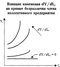 Рассмотрим теперь вопрос о том, как влияют на эти стандартные кривые безразличия изменения каждого из параметров a, ni, Li. Проанализируем изменения функции при фиксированных а и ni). Выше уже отмечалось, что валовой доход коллективного предприятия зависит от трудового вклада каждого его члена. Тем не менее конкретный работник воспринимает эту зависимость по-разному. Так, если коллектив достаточно велик, то связь личного трудового вклада с общим доходом может стать неочевидной, субъективно неощущаемой. В этом случае валовой доход Y оказывается непосредственно для работника некоей константой, не зависящей от его личного труда Li. Иначе говоря, при dY/dfL, приближающихся к нулю, кривые безразличия становятся все более пологими и в предельном случае превращаются в горизонтальную прямую (см. рис. 2).