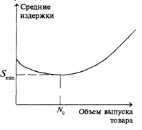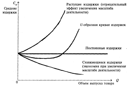 На рис. 1 показаны возможные зависимости между средними издержками и объемами выпуска продукции. U-образная кривая средних издержек суммирует свойства, присущие трем остальным кривым затрат, изображенным на том же графике.