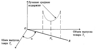 Термин «луч» OR объясняет, почему издержки называются лучевыми средними издержками. Любая точка луча OR соответствует определенному масштабу деятельности фирмы по товару 7, и товару Ту но при фиксированной структуре. Поскольку вдоль каждого такого луча динамика средних издержек будет вполне определенной, то точка Ny, в которой достигается минимум ЛСИ, соответствует наиболее эффективному масштабу деятельности фирмы при структуре выпуска товаров, определяемой лучом OR.