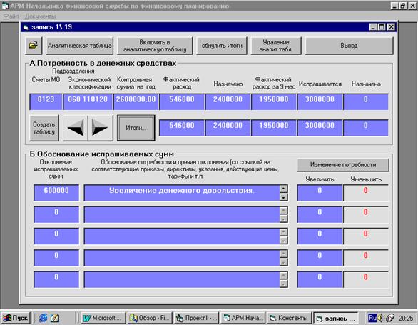 После загрузки сметы расходов нажатием кнопки «итоги» осуществляется расчет итогов по всем графам сметы. Далее производится анализ и проверка смет расходов, представленных воинскими частями. В ходе анализа проверяется каждая испрашиваемая сумма. Переходы на предыдущую или следующую статью сметы расходов осуществляются кнопками соответственно .