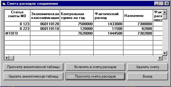Кнопка «смета расходов» – выводит на экран форму для определения потребности соединения в ассигнованиях и составления сметы расходов. (см.рисунок 2).