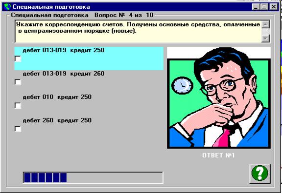 В настоящее время наиболее распространенными является программное обеспечение первого из указанных типов. К их достоинствам можно отнести относительную простоту в разработке алгоритмов, нетребовательность к языку программирования, простое и потому относительно доступное материально-техническое обеспечение. Такие программы можно готовить в течение короткого времени и, соответственно, быстро их модернизировать в соответствии с изменением законодательства и по иным причинам. Эти программы обычно представляют собой вывод на видеомонитор какого-либо вопроса с набором альтернативных ответов, из которых правильным является один или несколько в комбинации. (См. Рисунок 5).