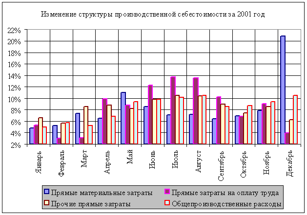 Как видно из графика, в летние месяцы удельный вес прямых затрат на оплату труда возрастает. Это связано с тем, что, во-первых, в летние месяцы, как было указанно выше, производится основная масса работ, связанных со верхним уровнем вскрыши; во-вторых, некоторые участки работ в летнее время переходят на непрерывный режим работы; в-третьих, зарплата большинства работников напрямую связанна с объёмом продаж. Кроме того, вследствие увеличения активности работы цеха безрельсового транспорта, происходит увеличение затрат на дизельное топливо; вследствие повышения активности деятельности предприятия в данное время возрастают затраты на ремонт.