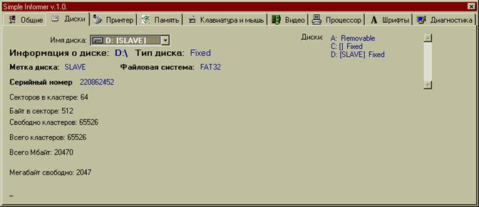 2. Диски – информация о всех дисках, установленных в системе, таких как жесткие диски, СД-РОМ, флоппи-диски, а также информация об их емкости, метке тома, и файловой системе.