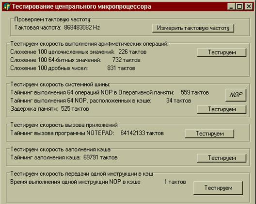 -скорость системной шины – здесь мы проверяем скорость шины между процессором и памятью, т.е. за сколько тактов передается информация между ними. Используется инструкции НОП, расположенные в первом случае в оперативной памяти, а во вотром случае – в кэш-памяти.