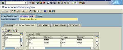 Новый ракурс создается путем ввода нового имени в поле «Ракурс» и нажатием кнопки «Создать». Далее указываются необходимые таблицы и условия их соединения. В данном случае был создан ракурс «ZMZTARNGM_TEXT» - ракурс текстов мероприятий.