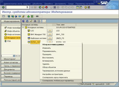 Копирование глобальных параметров осуществляется посредством запуска транзакции RSA1. Далее осуществляется переход в закладку «Исходные системы». Выбирается исходная система, в данном случае это система R3T01_101 – продуктивная система SAP R/3 (рисунок 21). По нажатию на выбранную систему правой кнопкой мыши на всплывающем окне необходимо выбрать «Скопировать глобальные переменные». В появившемся диалоговом окне следует выбрать копируемые параметры и нажатием клавиши «F8» подтвердить выбор копируемых переменных.