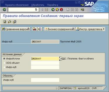 Правила обновления настраиваются в транзакции RSA1 на закладке «Инфо-провайдеры». Выбрать в контекстном меню пункт «Создать правила обновления». Далее указываются правила обновления (рисунок 28). После установки всех необходимых параметров: выбор инфо-источника, ODS-объекта, вспомогательного инфо-куба нажатием кнопки «Активировать» сохраняются все сделанные настройки и данные составляются в инфо-куб. Также далее возможна последующая обработка данных инфо-куба посредством OLAP – процессора.