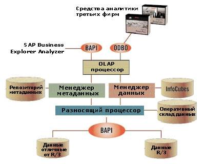 SAP BW использует кубы InfoCube в качестве своего источника данных. Эти кубы хранятся в базе данных по схеме "звезда". Для того, чтобы конечный пользователь мог обратиться к кубам InfoCube, администратор Хранилища данных с помощью приложения Business Explorer Analyzer компании SAP готовит эти кубы, разбивая их на кубы Query Cubes. Затем эти кубы активируются, чтобы к ним было можно обратиться через ODBO, то они становятся доступными для программ анализа, предлагаемых третьими фирмами.