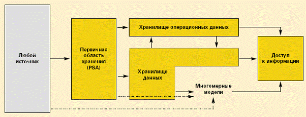 Хранилище данных (рисунок 6) является относительно статичным. Оно спроектировано для оптимизации запросов на крупные объемы исторических и агрегированных данных, для поддержания в основном стратегического, а не оперативного процесса принятия решений.