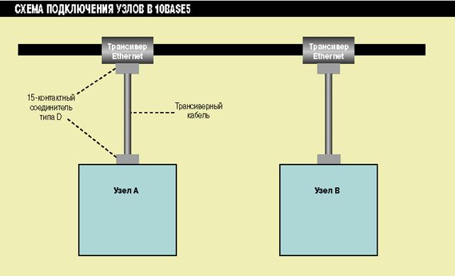 Рисунок 13 В 10Base5 узел подключается к кабелю с помощью трансивера и трансиверного кабеля.