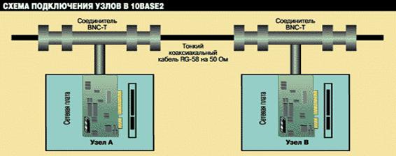 Рисунок 14 В 10Base2 узел подключается к кабелю напрямую с помощью соединителя BNC-T.