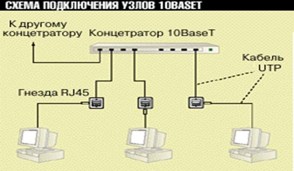 Рисунок 15 В 10BaseT узлы подключаются к концентратору по физической топологии "звезда".