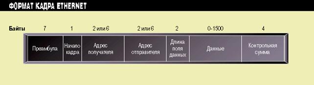Как и всякий кадр, Ethernet_II начинается с семибайтной преамбулы, состоящей из чередующихся единиц и нулей, и однобайтного начального ограничителя кадра, в котором два младших бита равны 112, а не 102, как остальные биты в преамбуле и ограничителе. Однако, если быть более точным, в Ethernet_II преамбула не разделяется на собственно преамбулу и начальный ограничитель кадра - и это является одним из отличий Ethernet от IEEE 802.3, хотя весьма несущественным, можно сказать, схоластическим, тем более что очень часто преамбула вообще рассматривается как часть физического механизма синхронизации передающей и принимающей стороны, а не как часть кадра (поэтому на рисунках мы не будет обозначать преамбулу и начальный ограничитель).