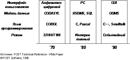 Обьектно-ориентированные СУБД (ООСУБД) стали разрабатываться с середины 80‑х годов в основном для поддержки приложений САПР. Сложные структуры данных систем автоматизированного проектирования оказалось очень удобно оформлять в виде объектов, а технические чертежи проще хранить в базе данных, чем в файлах. Это позволяет обойтись без декомпозиции графических структур на элементы и записи их в файлы после завершения работы с чертежом, выполнения обратной операции при внесении любого изменения. Если типичные реляционные базы данных имеют связи глубиной в два уровня, то иерархическая информация чертежей САПР обычно включает порядка десяти уровней, что требует достаточно сложных операций для “сборки” результата. Объектные базы данных хорошо соответствовали подобным задачам, и эволюция многих СУБД началась именно с рынка САПР.