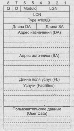 После установления соединения на канальном уровне конечный узел должен установить виртуальное соединение с другим конечным узлом сети. Для этого он в кадрах LAP-B посылает пакет Call Request протокола Х.25. Формат пакета Call Request показан на рис. 1.3. Этот пакет является пакетом сигнализации для сети Х.25, которая отличается тем, что режим сигнализации в ней не выделен в отдельный протокол, а представляет собой один из режимов работы общего протокола сетевого уровня Х.25/3.