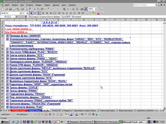 Книга – именно так называется Документ Excel – состоит из Листов. Перейти к нужному листу можно при помощи закладки которая расположена в нижнем правом углу окна программы. Лист состоит из ячеек, каждая из которых может содержать текст, число или формулу. Каждая ячейка на рабочем листе имеет свой адрес, он образуется из буквы, обозначающей столбец и цифры, соответствующей номеру строки.