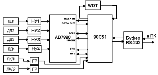 AD7890 (далее АЦП) служит для того чтобы, переключать требуемый канал коммутатора, преобразовать аналоговую величину напряжения в соответствующий ей двоичный цифровой код.