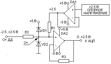В систему сбора данных входят три линейных и один нелинейный датчики давления. Выходной диапазон напряжения нелинейного датчика давления составляет -2.5 +2.5, в входной диапазон АЦП – 0 +2.5. Согласовать уровни напряжения выхода датчика давления и входа АЦП можно с помощью схемы представленной на рис. 4. Данная схема состоит из: операционного усилителя – DA1, повторителя напряжения – DA2, схемы смещения – R1 и R2, схемы защиты – VD1 и VD2 Для того чтобы не нагружать источник опорного напряжения[1] в состав схемы нормирующего усилителя вводится повторитель напряжения. Данная схема вносит в ССД погрешность.