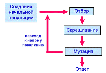 Эволюционная теория утверждает, что каждый биологический вид целенаправленно развивается и изменяется для того, чтобы наилучшим образом приспособиться к окружающей среде.Можно сказать, что эволюция - это процесс оптимизации всех живых организмов. Основной механизм эволюции - это естественный отбор. Его суть состоит в том, что более приспособленные особи имеют больше возможностей для выживания и размножения и, следовательно, приносят больше потомства, чем плохо приспособленные особи. При этом благодаря передаче генетической информации (генетическому наследованию) потомки наследуют от родителей основные их качества. Таким образом, потомки сильных индивидуумов также будут относительно хорошо приспособленными, а их доля в общей массе особей будет возрастать. После смены нескольких десятков или сотен поколений средняя приспособленность особей данного вида заметно возрастает. Схема генетического алгоритма приведена на рисунке справа.